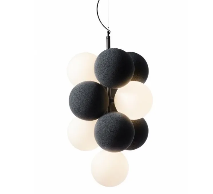 Ce luminaire en verre opale offre une belle lueur uniforme. Les absorbants sphériques souples sont fabriqués à partir de tissu recyclé dans le matériau Soundfelt REC et sont dotés d’un revêtement en tissu chiné tricoté en 3D (polyester) sans coutures. Le tissu est disponible en 3 coloris différents : Anthracite -20, Terracotta -21, gris clair -22. La suspension se décline en 2 versions : horizontale et verticale.