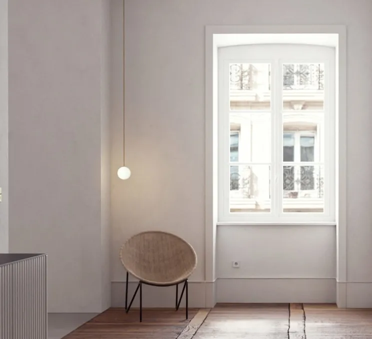 La suspension Laurent 10, en finitions laiton et noire, est composée d’un globe de verre opalin, soufflés à la main, suspendu à une corde en laiton et rattachée à une rosace noire.