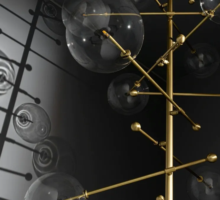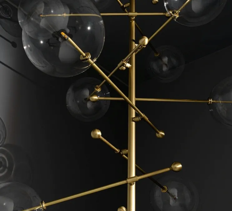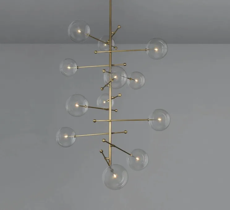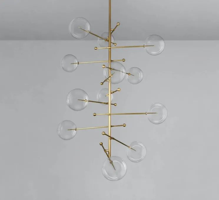 Ce lustre se compose de duos de globes en verre soufflé à la bouche, gravitant en équilibre, autour d’un axe central en laiton. L’asymétrie forme une composition gyroscopique, apportant une élégance interstellaire à un intérieur.