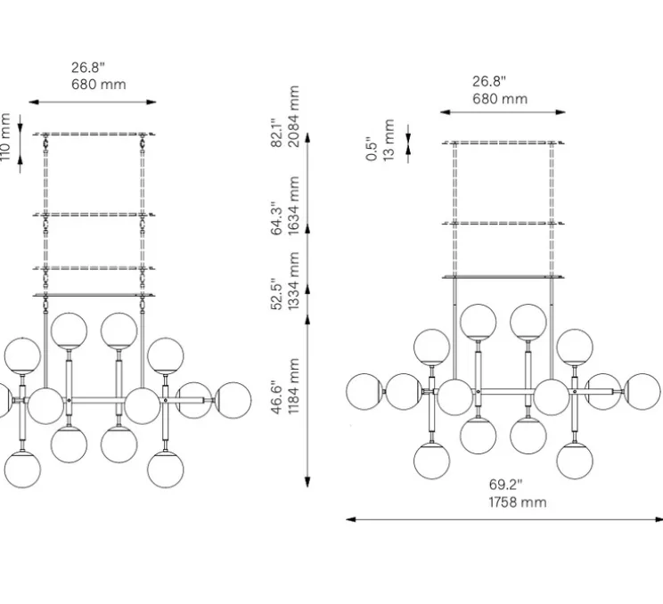 Ce lustre se compose de globes de verre sophistiqués autour d’une tige en laiton. La structure enchanteresse des orbes soufflés à la bouche crée une forme changeante qui change à chaque vue.