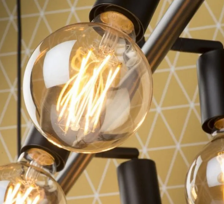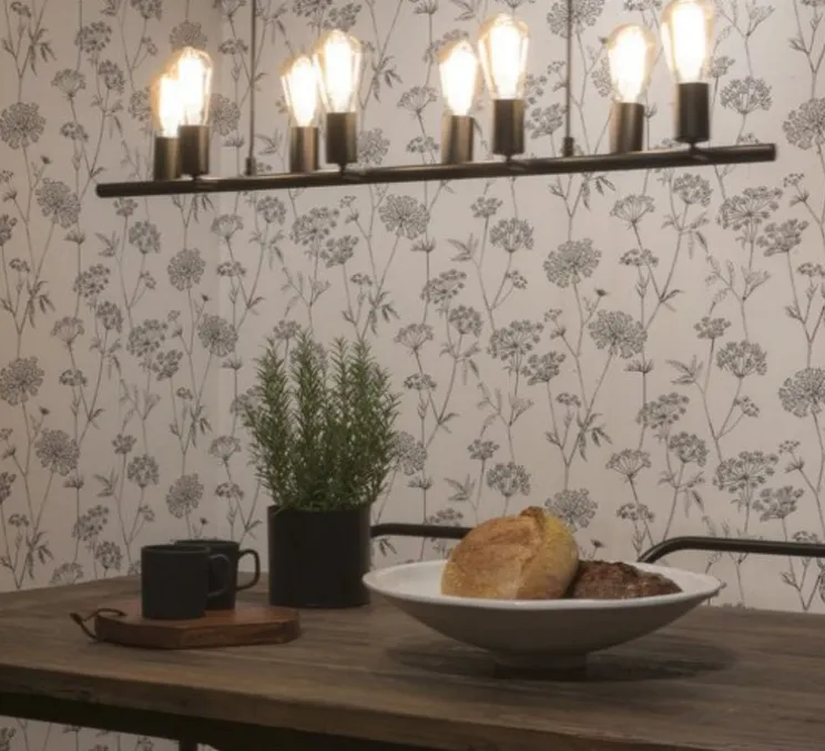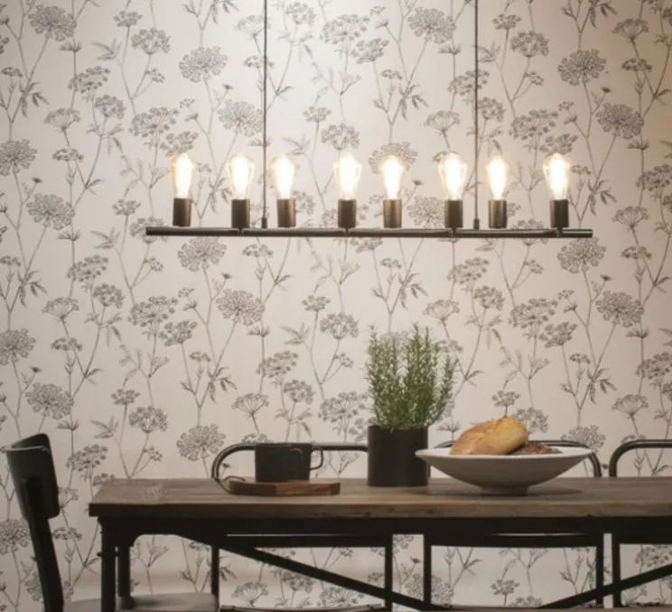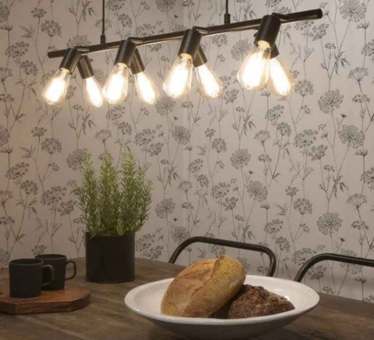 Elle est en métal. Les dimensions sont de 105 cm de longueur, 28 cm de largeur et 28 cm de hauteur. Elle pèse 2,2 kg. Les 8 ampoules ne sont pas fournies avec la lampe : 8xE27, max 25W. Le câble est de 175 cm de longueur, en tissu noir ou gris. La fixation au plafond mesure 55 cm de longueur, 5 cm de largeur et 2,5 cm de hauteur.