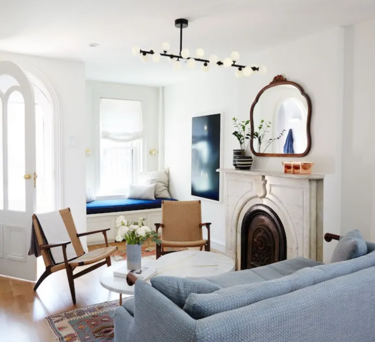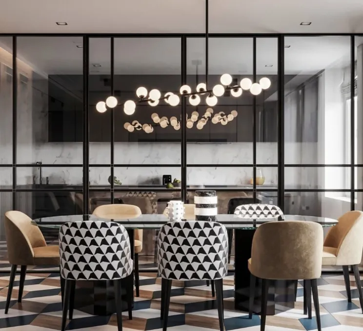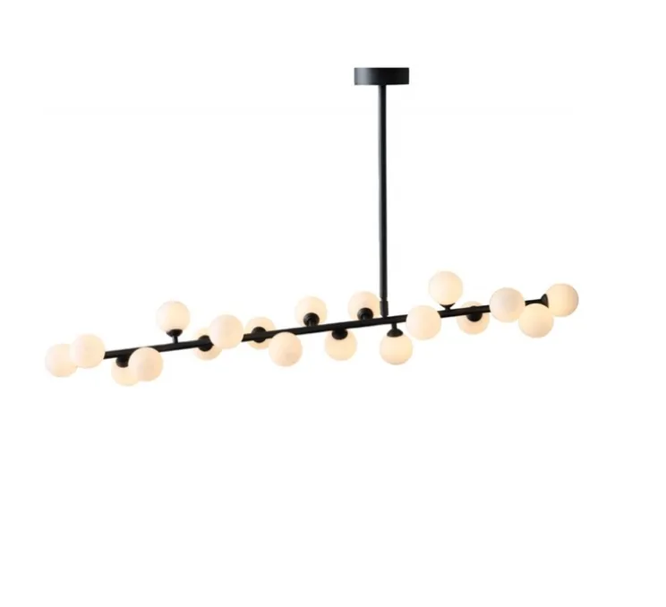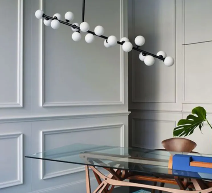 Cette suspension simple et légère, joue avec des éléments géométriques, comme la ligne et la sphère. Son bras légèrement incliné, asymétrique et horizontal est entourée par plusieurs sphères en verre opalin. SA structure en métal laqué époxy noir a une hauteur de 60cm et une longueur de 110cm. L’élégante suspension Mimosa est idéale dans un salon ou salle à manger.