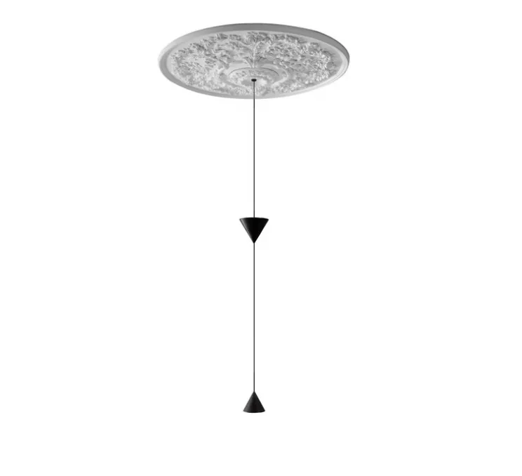 Avec son design léger et minimaliste, cette suspension sera parfaite pour intégrer des espaces modernes ou contemporains. Composée d’une grande rosace en plâtre blanc avec des motifs floraux à laquelle est suspendu un système LED en cônes d’aluminium.