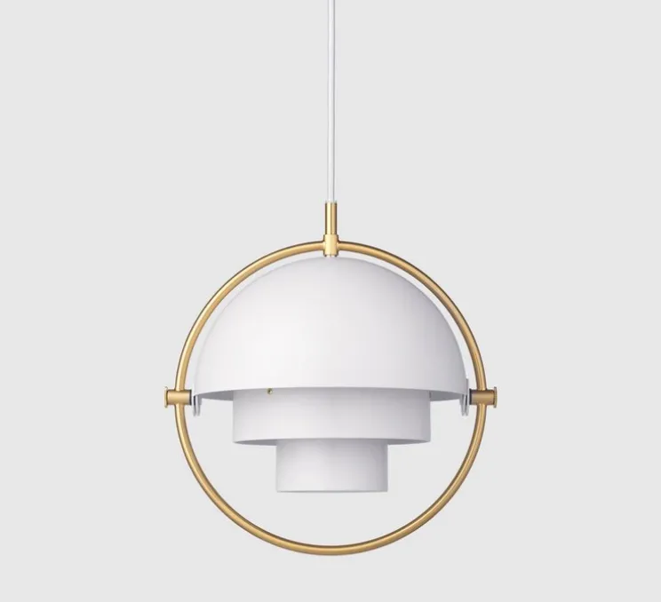 La maison d’édition Gubi réédite la célèbre suspension Multi-Lite Small, laiton et blanc imaginée par Louis Weisdorf en 1972.