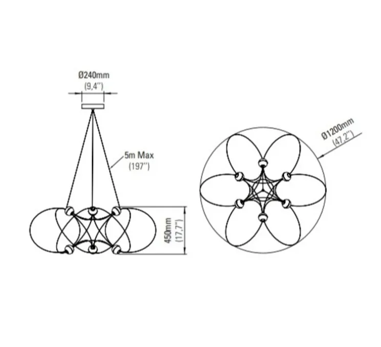 La suspension mesure 120 cm de longueur pour 45 cm de hauteur. Les sources lumineuses 2400K, 3840lm sont fournies.