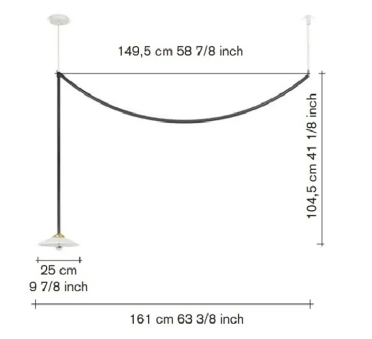 La suspension mesure 95cm de haut sur 149,5cm de long. Le diamètre de l’abat-jour est de 25cm. L’ampoule E27 n’est pas fournie. La longueur du câble est de 7m.