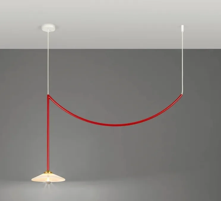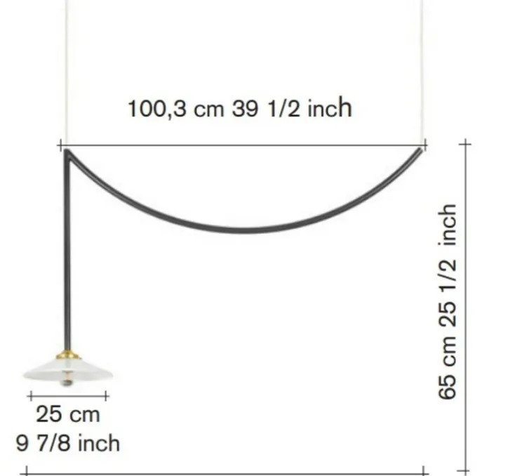 Le design de cette lampe est d’une simplicité presque naïve, et pourtant, les lignes qui la compose remplissent l’espace de manière ludique et colorée. La suspension N°5 est composée d’un tube en acier laiton courbé et d’un abat-jour blanc de 25cm de diamètre qui, selon Hannes Van Severen, « a une forme fantastique : parfaitement neutre ». Ce tube est raccordé à des cables en 2 endroits pour lui donner sa forme ondulée et le suspendre.