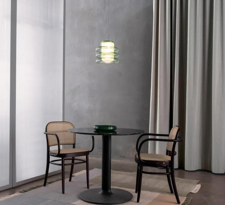La collection Pace puise son inspiration dans la notion de rythme, de tempo et de répétition. La lumière se diffuse à travers les couches de verre superposées, créant des dégradés subtils et des jeux de reflets. Élégante, empilable et pourtant généreuse dans ses courbes, la suspension Pace 28 apporte une touche graphique et aérienne à une salle à manger, un couloir ou une chambre. Pour un effet visuel raffiné, elle peut aussi être combinée en composition verticale avec d’autres éléments de la gamme.