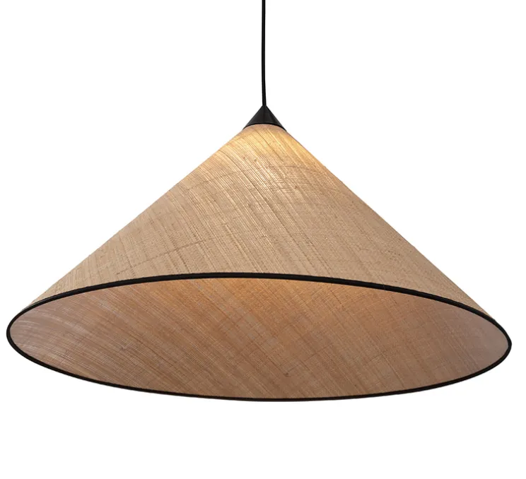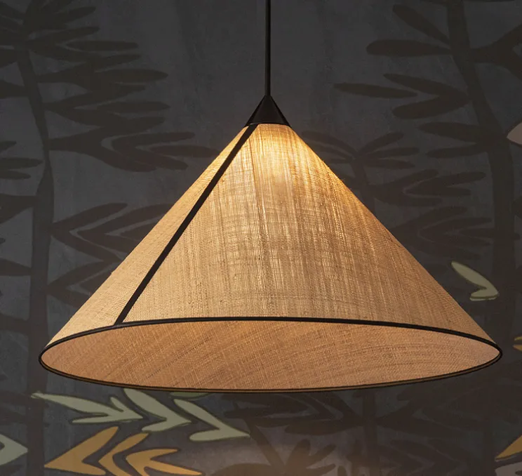 Le textile, partie prenante de l’ ADN de Designheure , apporte toujours ce complément de bien être et de personnalisation à leurs collections. Il rehausse tout en raffinement cette suspension de raphia fin et lui donne une intemporalité au delà de l’été. Un cône de finition noir achève de souligner la ligne et se coordonne aux passe poils noirs, pour un effet Couture et Graphique.