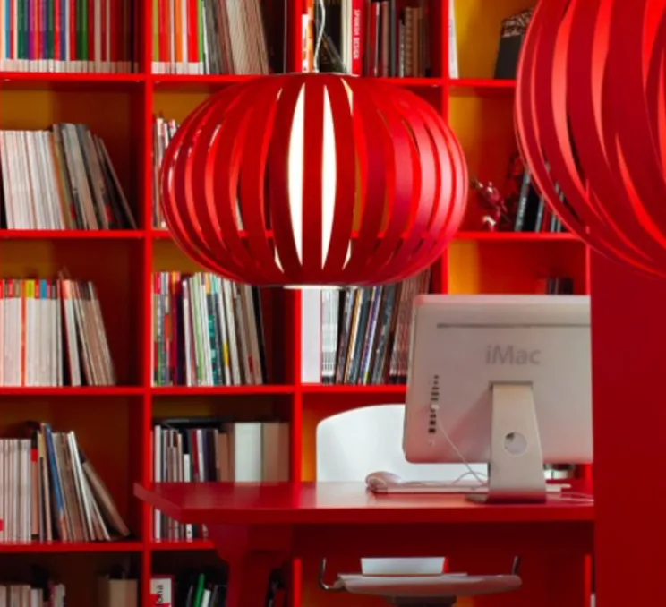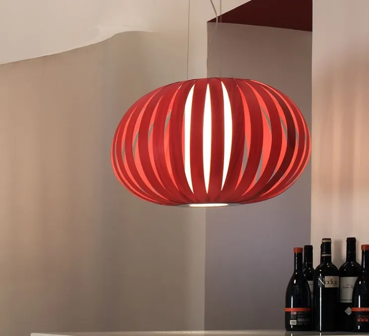 La lampe teintée rouge diffuse une lumière chaleureuse et agréable à travers ses rayons de bois coupés et assemblés à la main dans les studios de Valence. Poppy est l‘expression la plus naturelle de son style : une enclave géométrique et la répétition ordonnée des formes et fermée par une bague métallique.