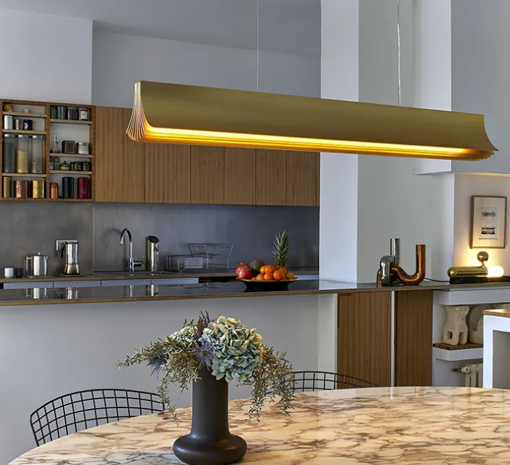 La suspension Respiro 3 mesure 120x15x17cm, avec son câble de 3m, il est possible de régler la hauteur de la suspension en fonction de la hauteur sous le plafond de votre intérieur. La suspension Respiro existe en une plus petite taille : la Respiro 2 de longueur 90 cm. Et en 2 autres coloris : noir et or, blanc et or pour chaque taille.