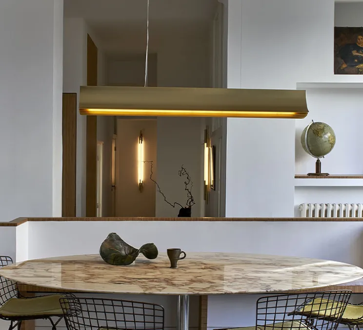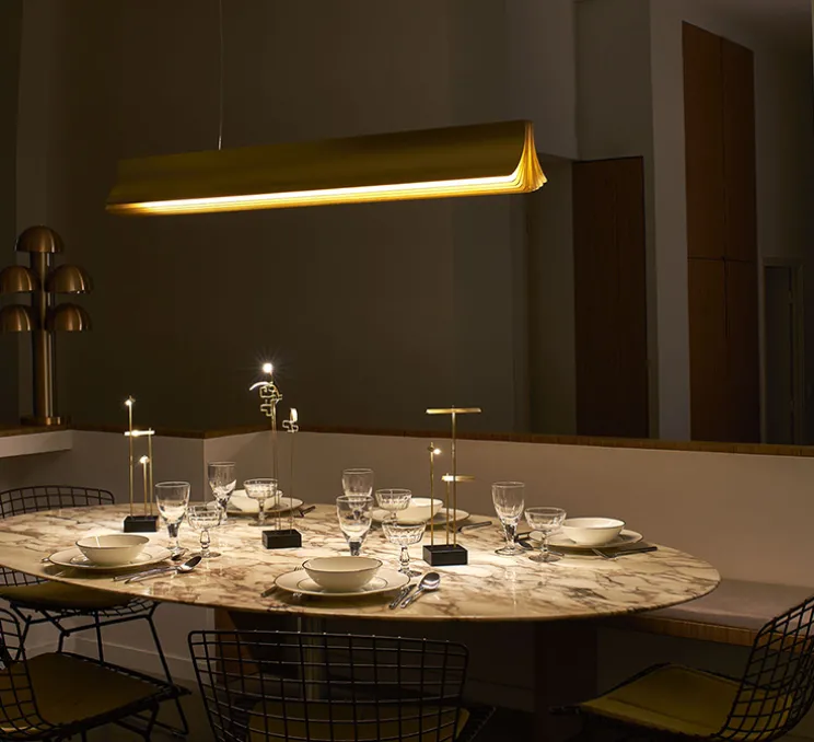 Ressemblant à un livre ouvert, la suspension Respiro 3 de chez DCW Edition Paris apporte de la légèreté à votre intérieur ! Le designer Philippe Nigro allie contemporain et élégance, en ajoutant une finition entièrement en or, la suspension s’adapte à plusieurs styles et tons.