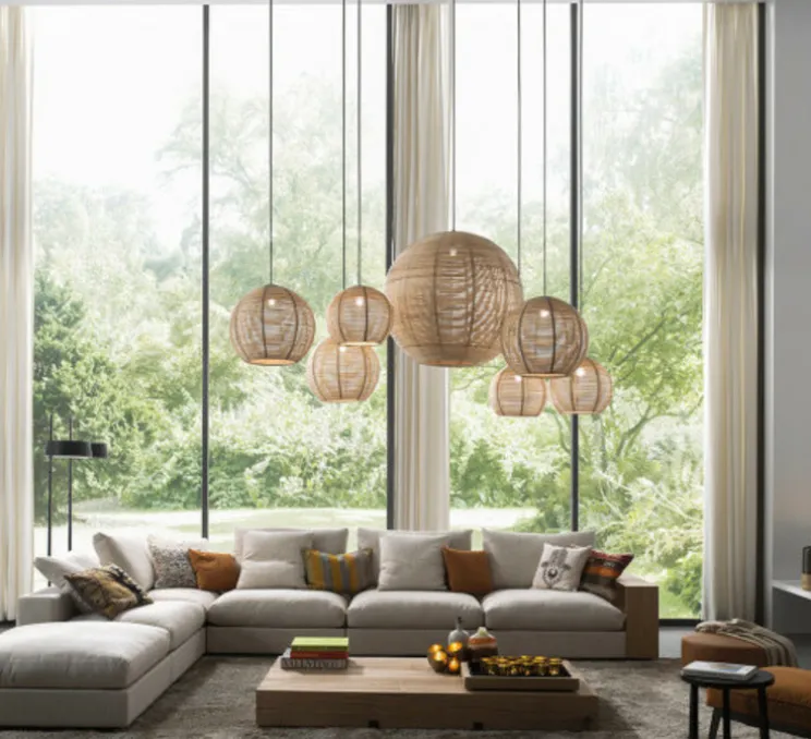 La structure en rotin de la suspension lumineuse Sangha diffuse la lumière de manière agréable en donnant l’impression d’être vraiment chez soi.