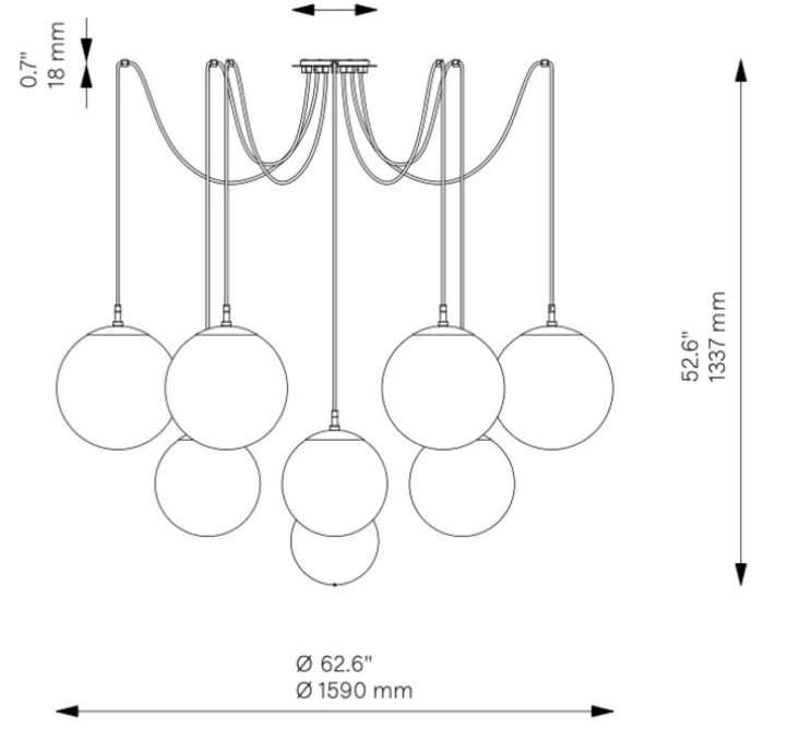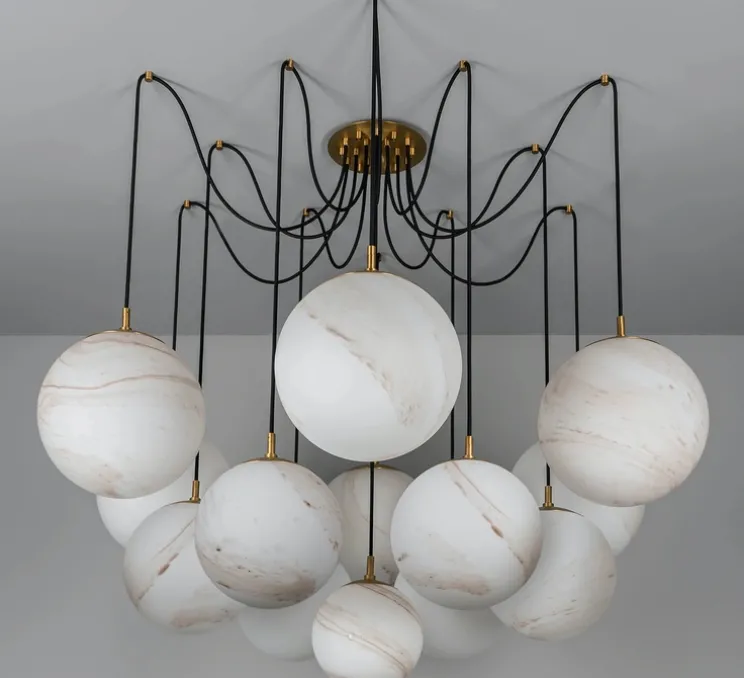 Ce lustre se compose d’un ensemble de treize globes suspendus de façon spectaculaire. Le drapé des câbles noirs crée une toile défiant la gravité, qui sert de pépinière à une cascade d’orbes brillants. La forme rend hommage à l’étrange beauté de l’arachnide, évoquant les sculptures iconiques de Louise Bourgeois.