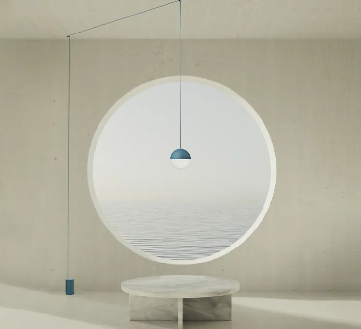 String Light est composée d’un abat-jour sphérique, d’un câble de 12 mètres et d’une alimentation avec interrupteur au sol. Minimal et poétique, tel un trait de crayon dessiné dans l’espace, String Light est un luminaire original, à la fois conceptuellement simple et audacieux. Ses créations s’orientant vers l’abstraction, dans une recherche de pureté et de dépouillement, le designer Michael Anastassiades s’inspire ici des câbles électriques défilant par la fenêtre d’un train, reliant les pylônes et divisant le paysage. Transposé ici dans une architecture d’intérieur, un fin fil électrique bleu complète l’environnement intérieur, séparant l’espace selon une infinité de configurations, sans se soucier de la position de la source d’électricité.