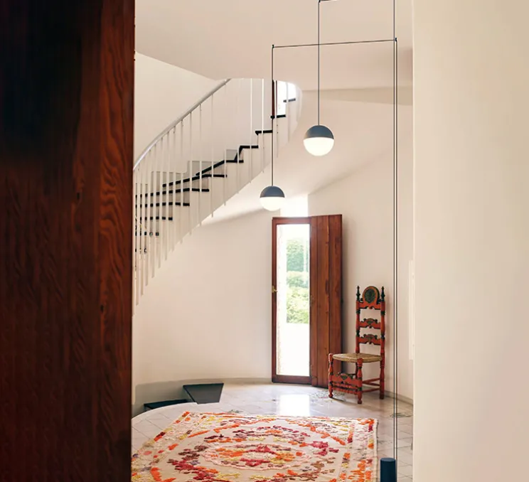 String Light (abat-jour sphérique, câble de 12 mètres, alimentation sol) est une suspension imaginée en 2014 par le designer Michael Anastassiades pour la maison italienne Flos.