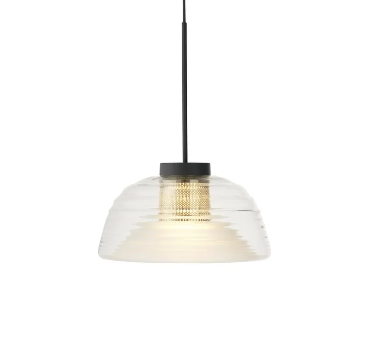Son verre ondulé, associé à une maille d’acier perforée, crée des effets optiques captivants sous différents angles. Avec son style sphérique, elle s’installe idéalement au-dessus d’une table de salle à manger ou d’un comptoir, offrant une lumière diffuse sans éblouissement.