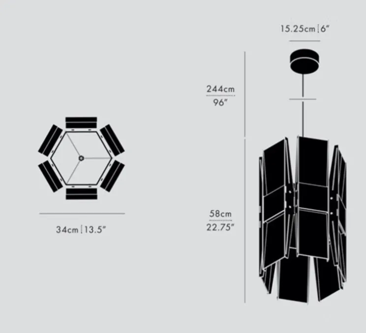 La suspension Vector à 6 panneaux mesure 58cm de hauteur, 34cm de longueur et 34cm de profondeur. Le module Led intégré diffuse une lumière directe et indirecte et propose un mode de variation en coupure de phase. Installation au plafond.