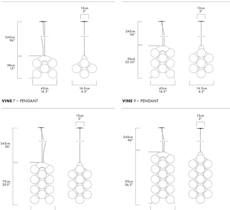La suspension Vine 3 fait 42 centimètres de diamètre et 38 centimètres de hauteur. Elle est fournie avec un câble de 2,43 mètres de long.