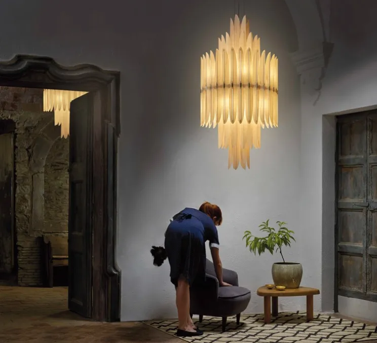 La suspension Volière, imaginée par Bodo Sperlein pour LZF, est une réinterprétation contemporaine du lustre Art déco des années 1920.