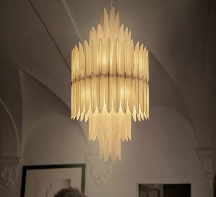 Inspirée par l’élégance des luminaires français de cette époque, Volière se distingue par ses éléments en feuilles de bois finement travaillés, disposés comme des plumes délicates. Ce design sculptural met en avant l’artisanat et le soin apporté aux matériaux, deux caractéristiques essentielles du travail de Sperlein. Légère et aérienne, la suspension Volière capture la légèreté et la fluidité des plumes, offrant un jeu visuel fascinant sous différents angles.