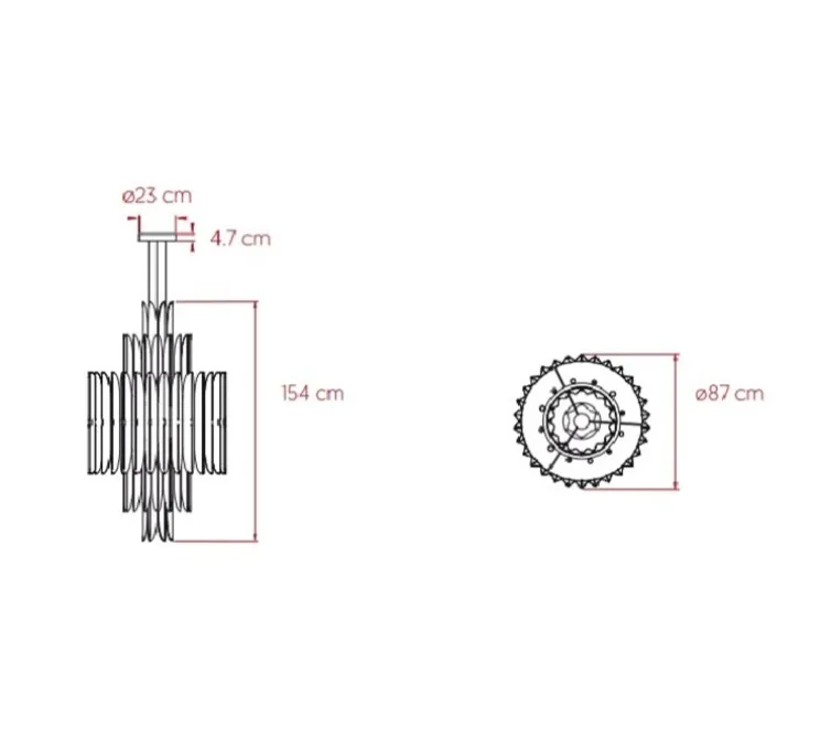 La suspension mesure 87cm de diamètre et 154cm de hauteur. Les sources lumineuses : 14 ampoules E14, 2800K, 7W et 2 ampoules E27, 3000K, 11W, sont fournies.