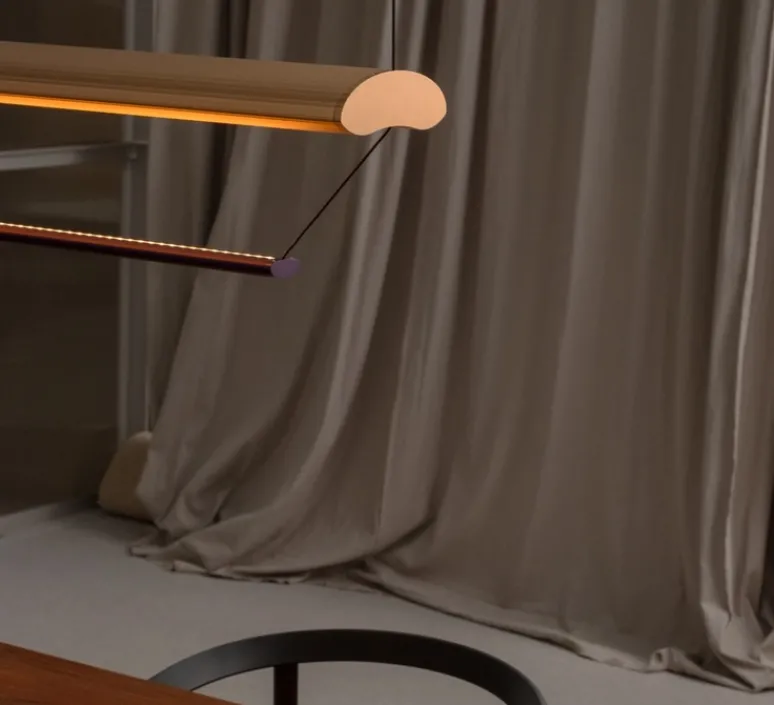 Avec ses lignes longues et structurées (L150 cm x H20 cm), la suspension Tier 150 joue sur une composition modulaire et sculpturale. Sa surface finement cannelée diffuse la lumière de manière uniforme en la réfléchissant sur le corps supérieur, dissimulant avec subtilité la source lumineuse directe. Dans cette version cuivre anodisé et rouge améthyste, elle devient un véritable élément d’architecture intérieure, idéale pour surplomber un grand espace de réception, une table de conférence ou une galerie contemporaine.