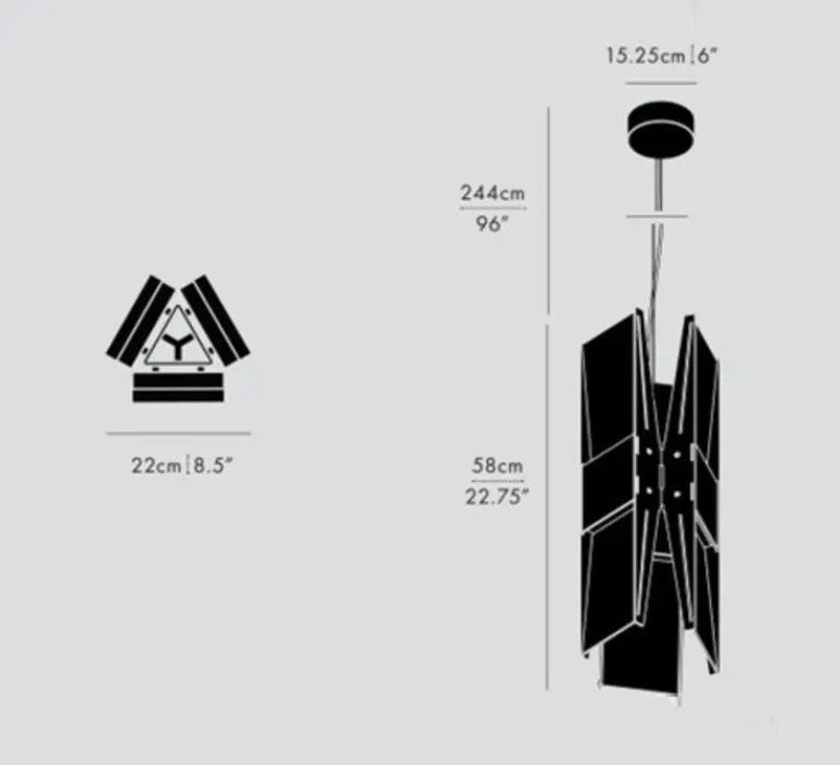 La suspension Vector à 3 panneaux mesure 58cm de hauteur, 22cm de longueur et 22cm de profondeur. Le module Led intégré diffuse une lumière directe et indirecte et propose un mode de variation en coupure de phase. Installation au plafond.