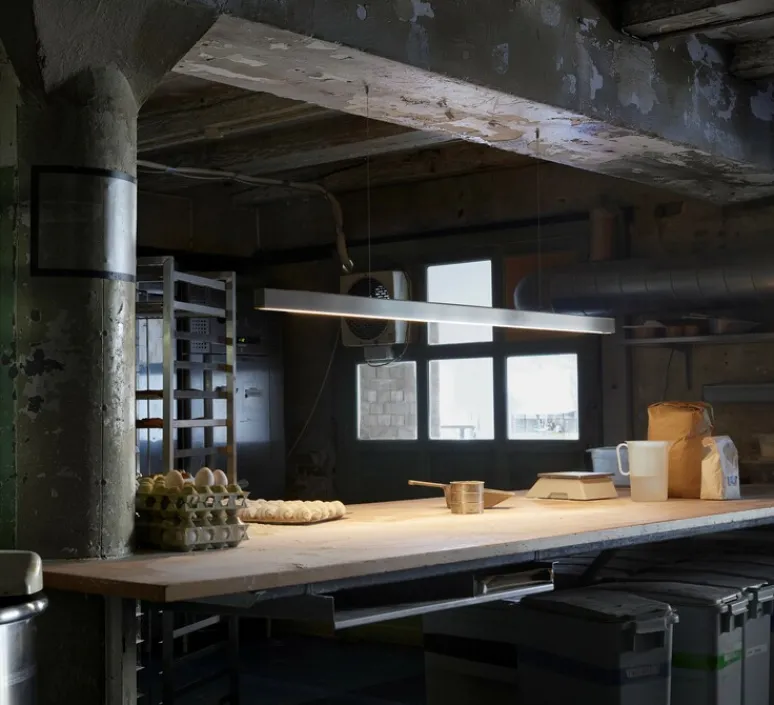 Le style industriel de la suspension I-Model Cordless apporte de la pureté dans la pièce où celle-ci se trouve. Le luminaire casse les courbes et impose sa simplicité à son environnement.