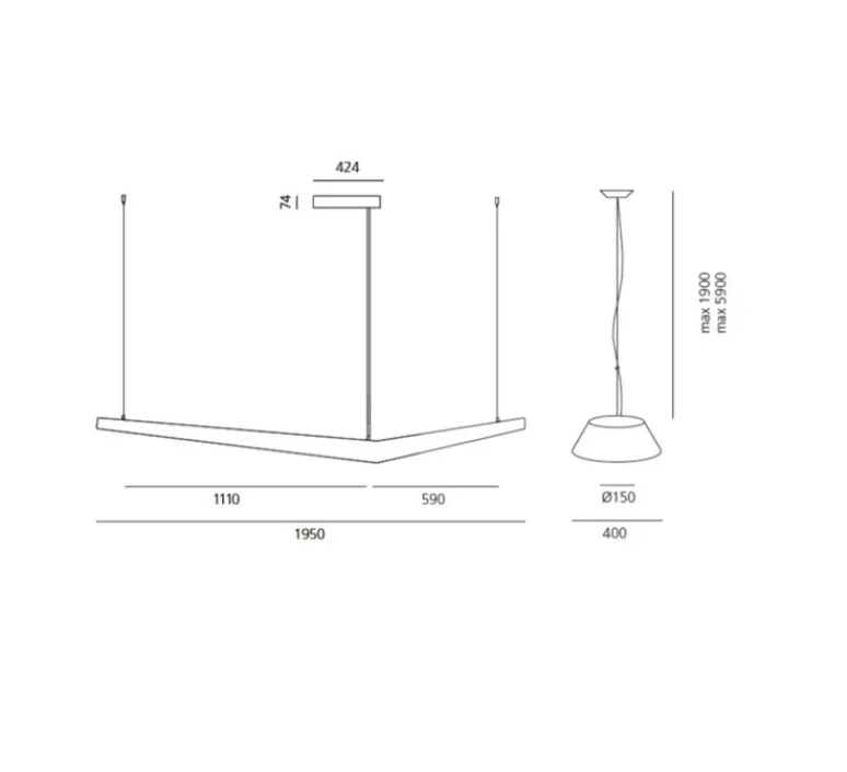 Le diamètre et la hauteur sont respectivement de 15cm et 195cm. La hauteur entre le plafond et la suspension peut être entre 190 cm et 590 cm. Opaline solide