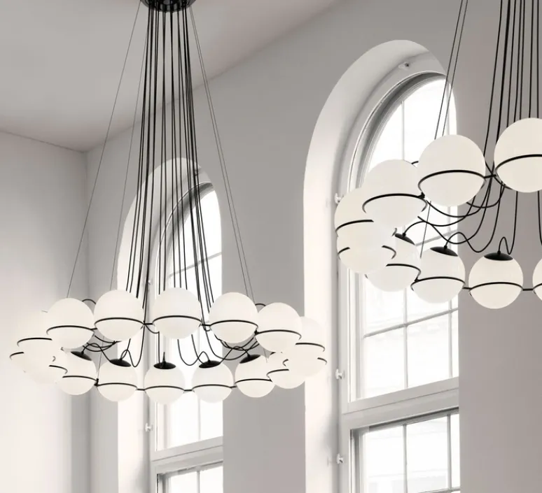 En effet, le fondateur d’Astep, Alessandro Sarfatti, a voulu rendre hommage à son grand-père en rééditant ces œuvres. Avec ses 16 verres opalins sphériques avec une structure noire, ce lustre fait partie de la collection iconique de Gino Sarfatti. Ce luminaire a été conçu initialement en 1959 et a été réédité en 2018 !
