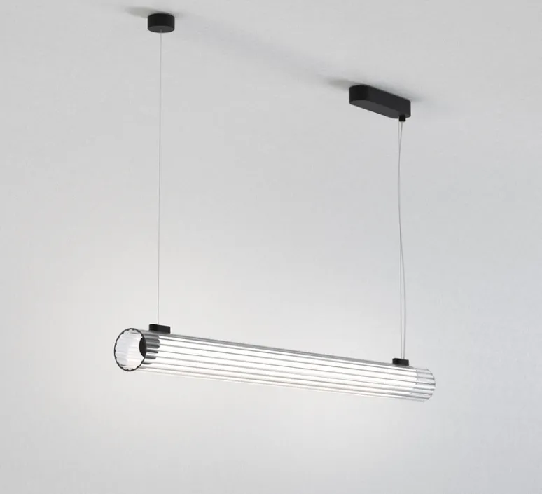 La suspension Pendant 1000 fait partie de la collection Io, cette dernière se décline sous deux formats tels que l’applique murale et la suspension. L’abat-jour en verre a été minutieusement réalisé en forme de cylindre avec des reliefs afin d’offrir un aspect délicat, fin et raffiné à votre intérieur. Cette note de luxe embellit subtilement n’importe quelle pièce à vivre. Elle est maintenue grâce à deux câbles blancs mesurant 2m, et les composants de la suspension sont discrètement camouflés dans deux rosaces noires, ainsi l’abat-jour attire tous les regards, tout en diffusant directement sa lumière.