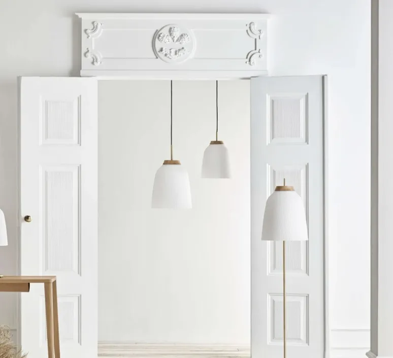 Conçue par le Studio Spant, renommé pour son ingéniosité artistique, cette suspension fusionne avec brio le métal blanc et le verre opal mat. Le mariage élégant du chêne huilé souligne l’esthétique nordique caractéristique de la marque.