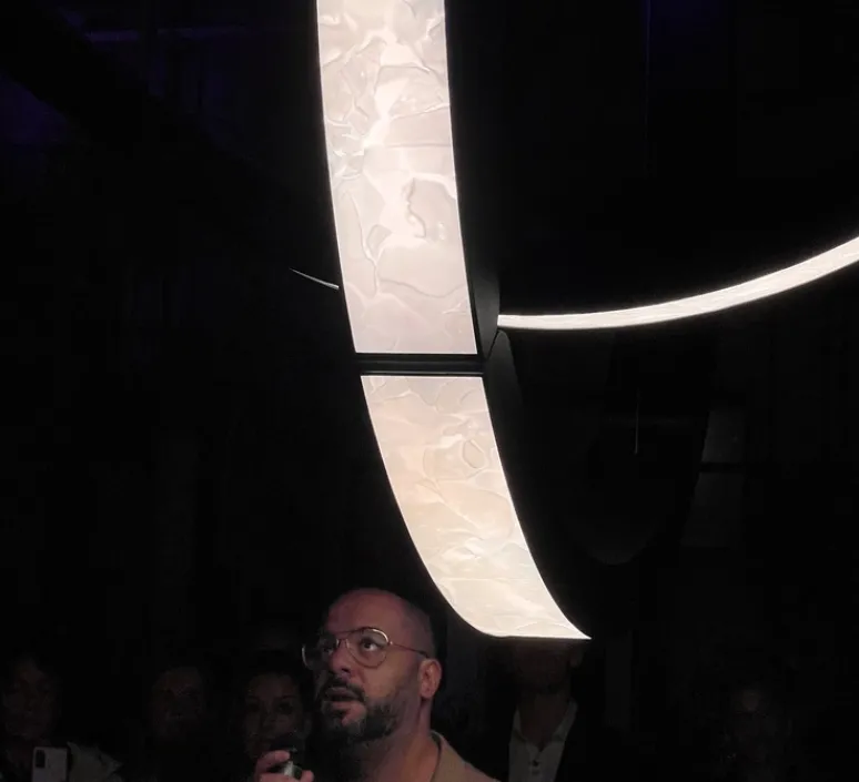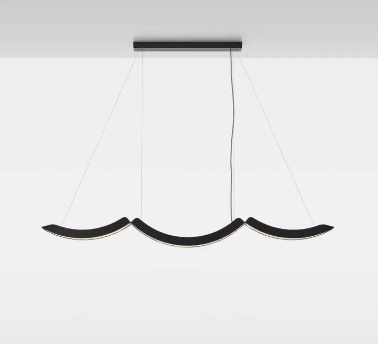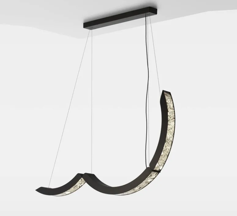 Elo se distingue grâce à plusieurs innovations techniques. La suspension se compose de métal et du verre Brokis. Il s’agit d’un verre recyclé qui offre un effet lumineux incomparable grâce aux jeux de lumières produits par la texture du verre. Ce luminaire comprend 3 arcs reliés entre eux par une articulation qui permet une variété de positions. Les 2 arcs extérieurs peuvent être positionnés presque à l’horizontal pour que l’ensemble forme un demi-cercle.