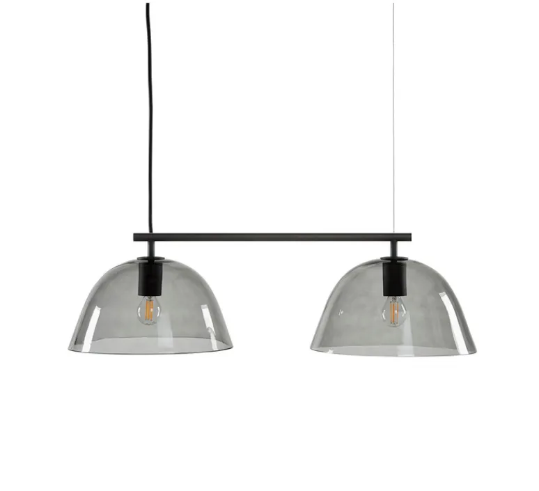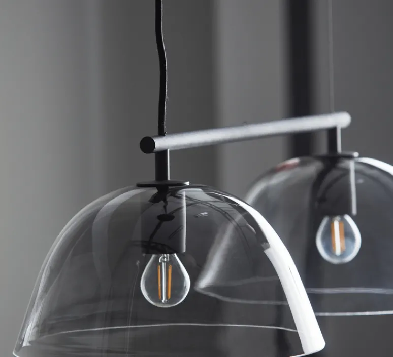 Découvrez l’élégante suspension Wendo 70, finition noir et verre fumé, imaginée par Monika Mulder pour la maison suédoise Cobankeryd.