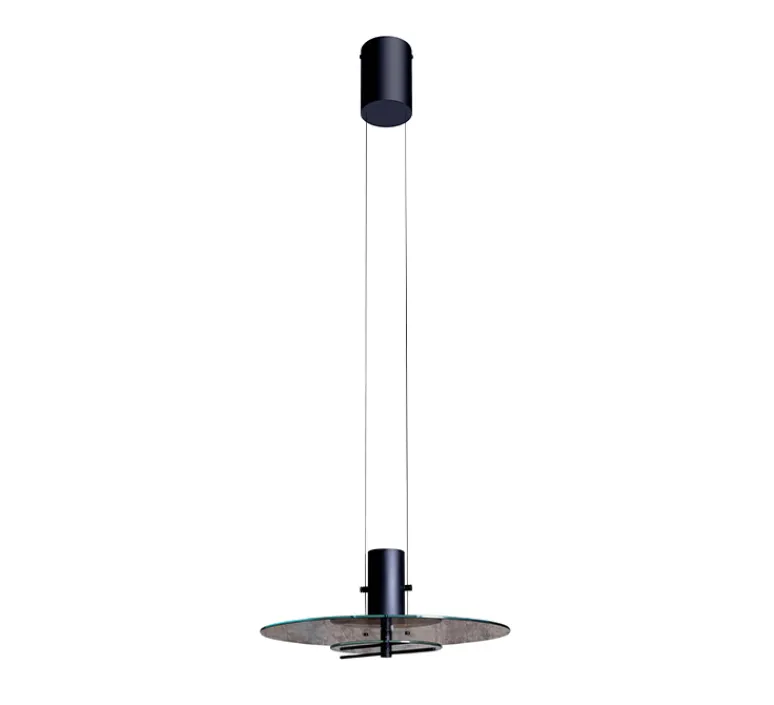 Le luminaire Delumina est composé d’une rosace, de deux câbles et d’un abat-jour fait d’un élément tubulaire, de deux disques de verre transparent de tailles différentes et d’une baguette métallique pivotable, permettant de noircir le verre inférieur. Envoutante et évolutive, la suspension Delumina suit chacun au grès de ses envies et besoins, se plaçant aussi bien au-dessus d’une table, que dans une pièce de vie ou un bureau.