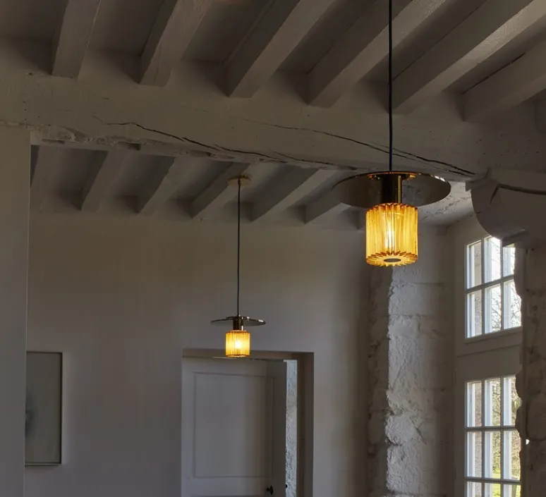 La suspension In the sun 270 est faite d’un disque en aluminium teinté or dans lequel se reflète un diffuseur en forme de soleil.
