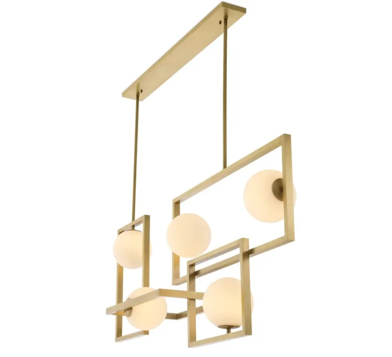 Le luminaire en finition laiton antique est suspendu à deux tiges réglables en hauteur. Des barres horizontales et verticales soutiennent les sphères en verre blanc pour créer une atmosphère chaleureuse qui apporte un style contemporain.