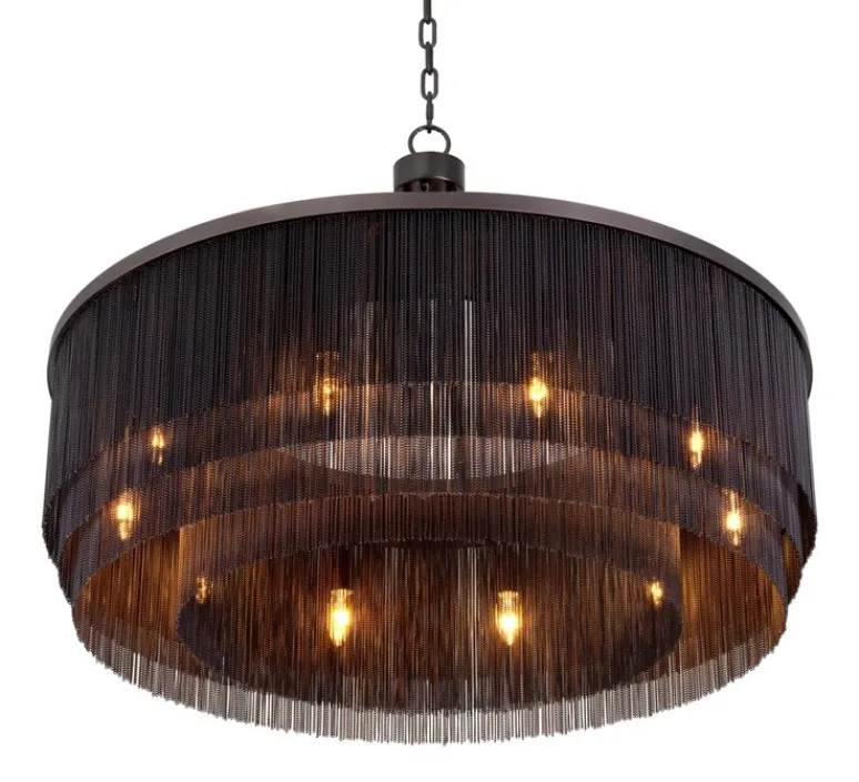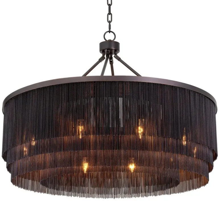 Le lustre Tissot L de Eichholtz est une pièce expressive qui évoque le glamour des années folles via ses rangées de chaînes fines disposées en franges rappelant les robes des années 1920.
