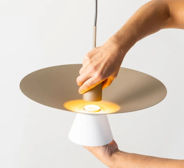 L’abat-jour métallique opaque est disponible en trois tailles différentes pour une plus grande polyvalence. En outre, il est interchangeable et peut être installé dans différentes positions, offrant ainsi la possibilité de créer de multiples formes. L’abat-jour en verre translucide émet quant à lui une lumière douce et enveloppante qui transforme n’importe quel espace en une atmosphère chaleureuse.