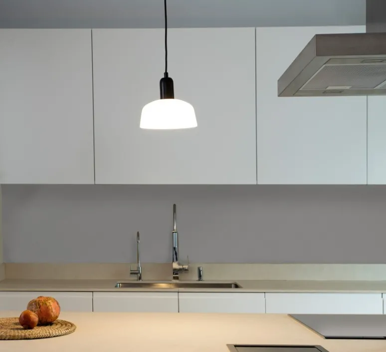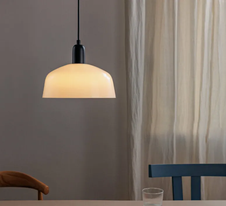 A la fois compacte et élégante, le luminaire présente un corps en aluminium et un abat-jour en verre opalin blanc. Il offre un éclairage direct et un confort visuel. La suspension possède un câble de 2m.
