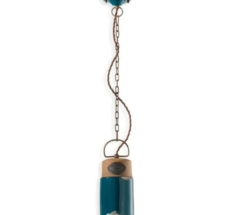 Il se présente sous la forme d’un cylindre en céramique bi matière surmonté d’une structure en chaîne métallique. La céramique est travaillée en 2 finitions, matte et brune sur le haut et brillante et verte sur la partie inférieure de la suspension. Ces associations de matières et couleurs donnent à la lampe un style unique.