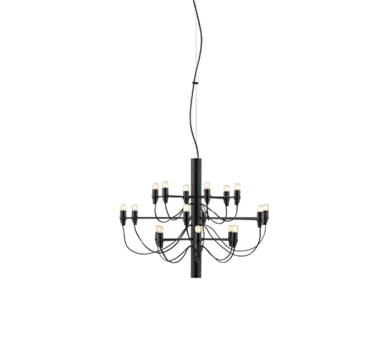 2097/18 est une suspension à lumière diffuse composée d’une structure centrale en forme de tube faite de fer, de laquelle partent dix-huit bras en laiton, chacun accueillant une ampoule. 2097 a la silhouette d’un chandelier classique et une allure moderne. Raffiné et iconique, 2097 s’intègre dans tous les intérieurs, qu’ils soient privés ou publics, classiques ou modernes, que la suspension soit utilisée dans un salon, au-dessus d’une table ou dans une entrée.