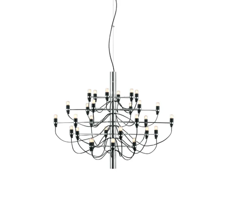 2097/30 est une suspension à lumière diffuse composée d’une structure centrale en forme de tube faite de fer, de laquelle partent trente bras en laiton, chacun accueillant une ampoule. 2097 a la silhouette d’un chandelier classique et une allure moderne. Raffiné et iconique, 2097 s’intègre dans tous les intérieurs, qu’ils soient privés ou publics, classiques ou modernes, que la suspension soit utilisée dans un salon, au-dessus d’une table ou dans une entrée.