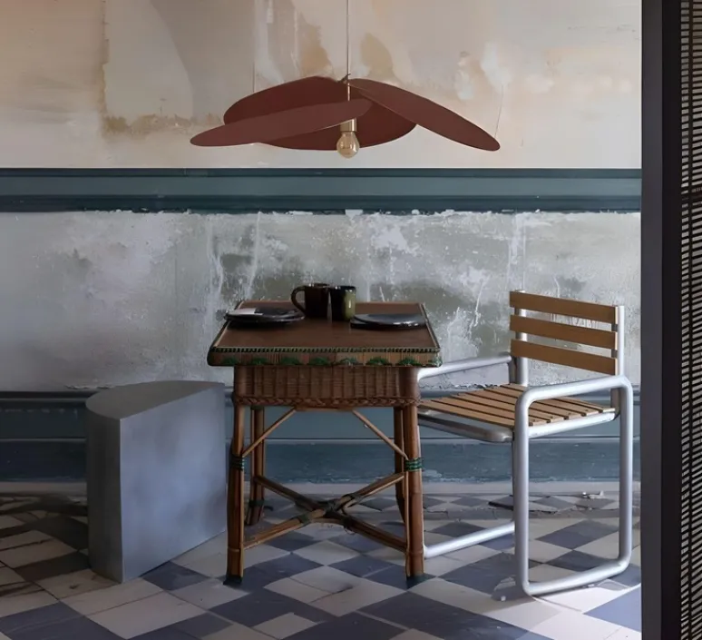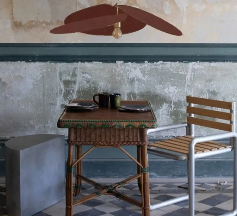 Cette suspension est un luminaire décoratif aussi bien de jour que de nuit (la couleur du tissu peut varier suivant l’éclairage). Son design est plus épuré que celui du modèle Pale et plus en rondeur. Les pales plus rondes cette fois-ci conservent les accents ensoleillés et la touche naturelle caractéristiques de Georges. Pensée trouve facilement sa place dans une chambre ou un salon et peut être l’atout coloré de votre cuisine ou de votre bureau.