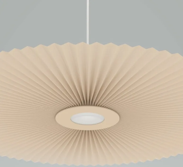 Ce luminaire est composé d’un disque en métal laqué et d’un tissu polyester sable doré. Il a été fabriqué au Portugal.