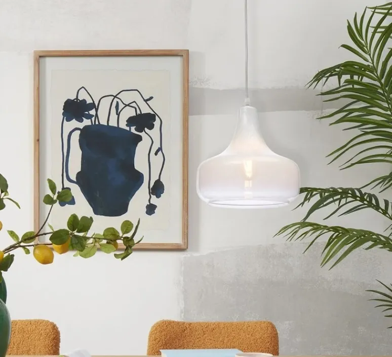 Cette suspension au style rétro et à la forme conique s’intègre parfaitement dans une décoration contemporaine. Le verre blanc laiteux diffuse une lumière douce et homogène à 360 degrés, créant une ambiance chaleureuse et accueillante. Installez-la au-dessus d’une table à manger, dans un salon ou une entrée pour un effet visuel saisissant.