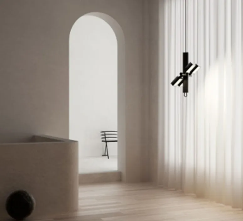 Le luminaire Dorval se compose d’une rosace, d’un câble et d’un abat-jour fait d’une structure centrale en croix et de quatre têtes lumineuses pivotables.