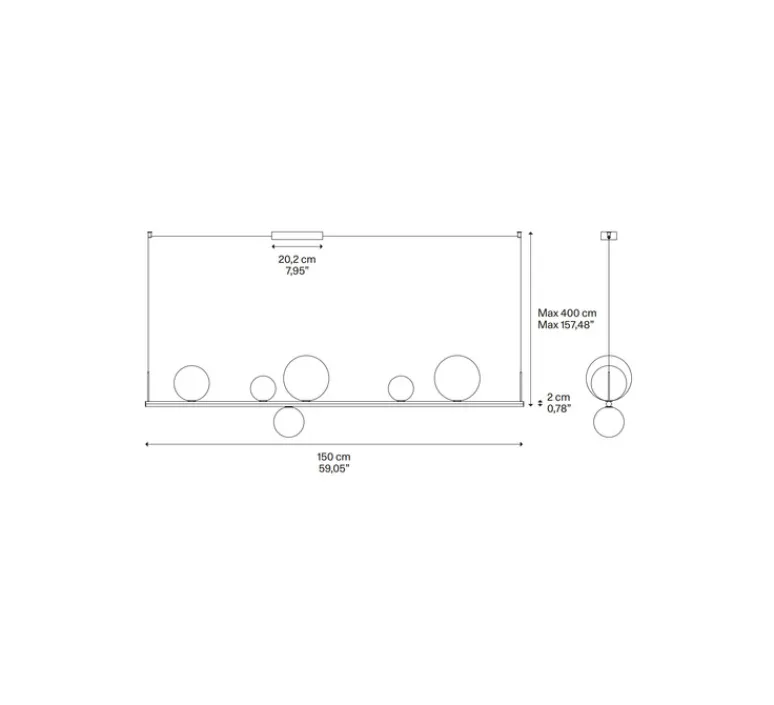 D’une grande flexibilité décorative, la suspension Random Stick long se distingue par ses dimensions généreuses de 150 cm de long et 2 cm de diamètre. A travers la disposition des diffuseurs sphériques de tailles variées (de 10 à 18 cm), la créatrice présente un luminaire au design subtile et poétique rappelant de fragiles bulles de savons prêtes à s’envoler dans les airs.