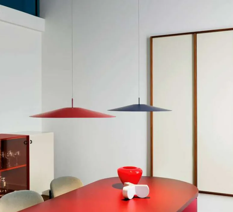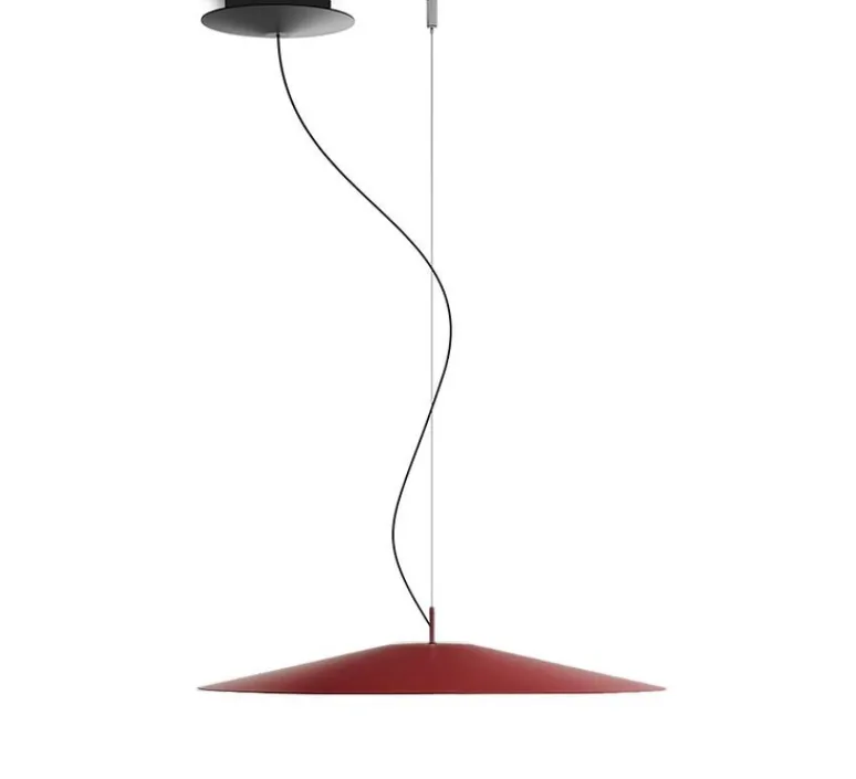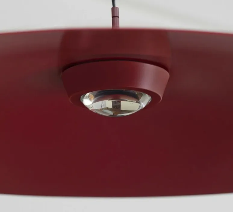 Découvrez la suspension Koinè, finition rouge mat, imaginée par le Studio Mandalaki pour la maison italienne Luceplan.